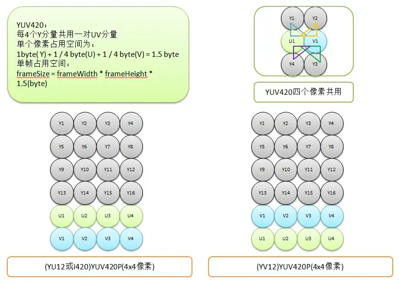 接下来是YUV420 每四个y分量公用一个UV分量,所以每个像素点占用1.5个字节空间,根据存储顺序不一样又分为四个不同的类型。