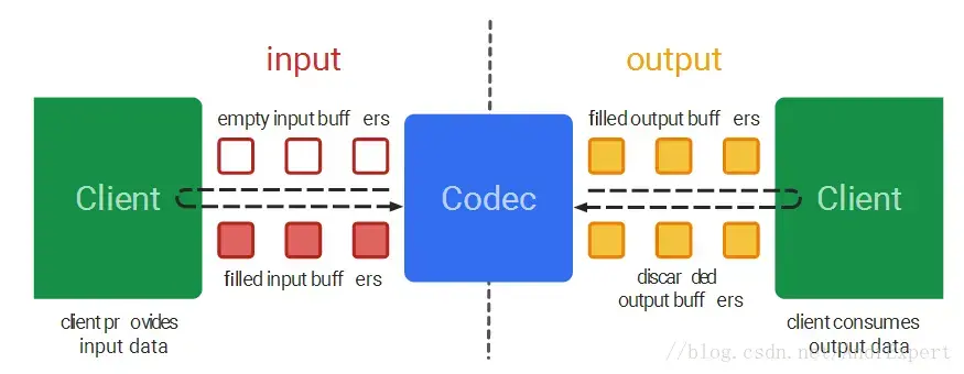 MediaCodec类Android提供的用于访问低层多媒体编/解码器接口,它是Android低层多媒体架构的一部分,通常与MediaExtractor、MediaMuxer、AudioTrack结合使用,能够编解码诸如H.264、H.265、AAC、3gp等常见的音视频格式。广义而言,MediaCodec的工作原理就是处理输入数据以产生输出数据。具体来说,MediaCodec在编解码的过程中使用了一组输入/输出缓存区来同步或异步处理数据:首先,客户端向获取到的编解码器输入缓存区写入要编解码的数据并将其提交给编解码器,待编解码器处理完毕后将其转存到编码器的输出缓存区,同时收回客户端对输入缓存区的所有权;然后,客户端从获取到编解码输出缓存区读取编码好的数据进行处理,待处理完毕后编解码器收回客户端对输出缓存区的所有权。不断重复整个过程,直至编码器停止工作或者异常退出。