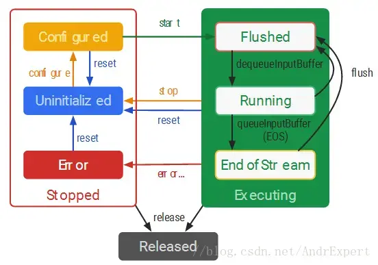 从上图可知,当MediaCodec被创建后会进入未初始化状态,待设置好配置信息并调用start()启动后,MediaCodec会进入运行状态,并且可进行数据读写操作。如果在这个过程中出现了错误,MediaCodec会进入Stopped状态,我们就是要使用reset方法来重置编解码器,否则MediaCodec所持有的资源最终会被释放。当然,如果MediaCodec正常使用完毕,我们也可以向编解码器发送EOS指令,同时调用stop和release方法终止编解码器的使用。