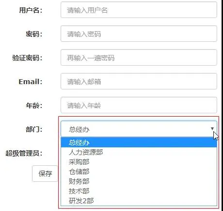 通过上图,可以清晰的看到,我们已经将完整的数据提交到后台 后台获取到这些数据之后,就能够将其保存到数据库中 那么,我们的保存功能就算完成了 更新功能: 更新和保存只有一个地方不同,就是需要数据回显 而数据回显中,我们只对部门(下拉框)和超级管理员(复选框)做一个说明,其他的因为都是普通的input元素,使用value属性显示数据即可 而下拉框和复选框需要单独进行处理,如下: <c:forEach var="d" items="{d.id}" {d.name} </c:forEach>