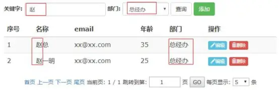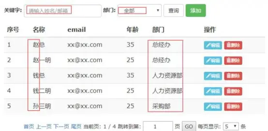 <input type="checkbox" id="admin" name="admin" ${employee.admin?'checked':''}> 这里,我们选择使用EL表达式的三元运算符进行判断,为下拉框添加selected属性,为复选框添加checked属性 编辑的时候,数据能回显,接下来的操作和新增一致 删除功能 和部门的删除一致,这里就不再赘述 到此,员工的CRUD结束 高级查询 功能需求: 输入关键字和部门信息进去过滤查询,关键字是根据姓名和邮箱两个字段查询 页面设计