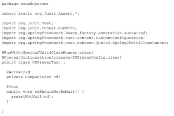 CDPlayerTest使用了Spring的SpringJUnit4ClassRunner,以便在测试开始的时候自动创建Spring的应用上下文。注 解@ContextConfiguration会告诉它需要在CDPlayerConfig中加载配置。因为CDPlayerConfig类中包含了@ComponentScan, 因此最终的应用上下文中应该包含CompactDiscbean