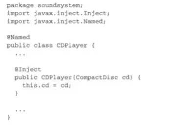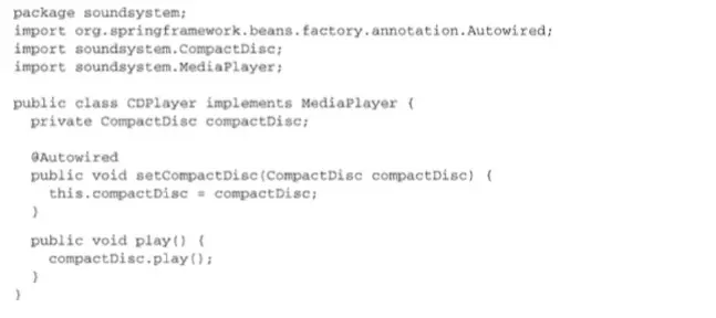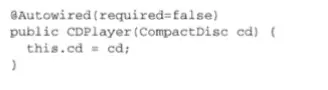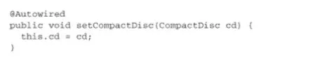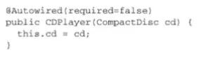 这表明当Spring创建CDPlayerbean的时候,会通过 这个构造器来进行实例化并且会传入一个可设置给CompactDisc类型的bean。 - 属性的setter方法上添加了@Autowired注解