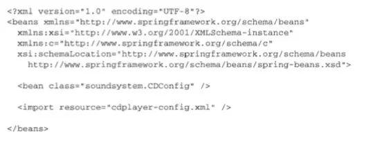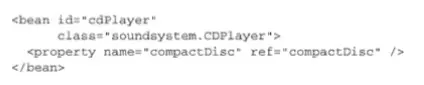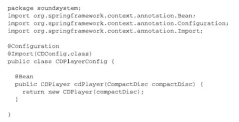 通过这种方式引用其他的bean通常是最佳的选择,因为它不会要求将CompactDisc声明到同一个配置类之中。在这里甚至没有要求CompactDisc必须要在JavaConfig中声明,实际上它可以通过组件扫描功能自动发现或者通过XML来进行配置。你可以将配置分散到多个配置类、XML文件以及自动扫描和装配bean之中,只要功能完整健全即可。不管CompactDisc是采用什么方式创建出来的,Spring都会将其 传入到配置方法中,并用来创建CDPlayer bean
