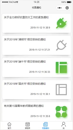 到这里我们已经完成了 tabbar 上两个(首页、课程表)主要的页面,这篇会讲到校园通知和用户管理两个页面.