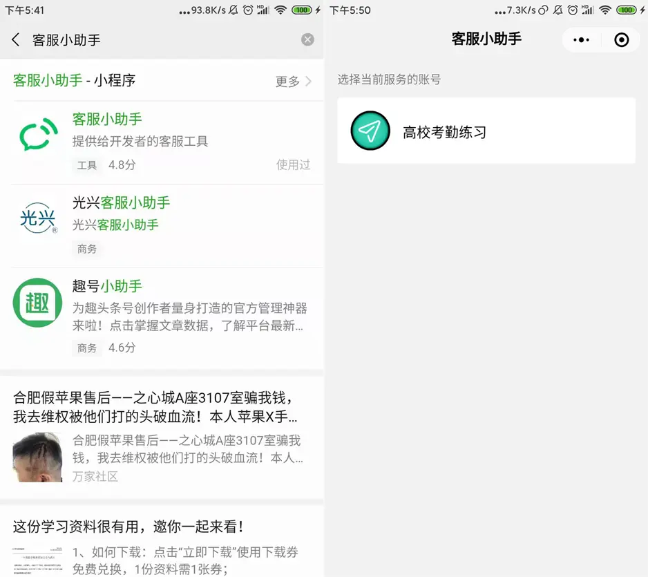 3.然后在手机上搜索 ‘客服小助手’ ,绑定的的小程序就可以实现在线客服功能 .