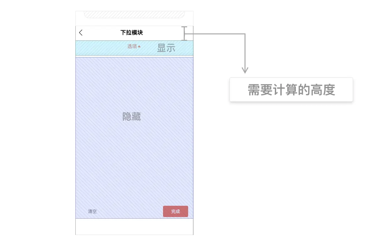 首先,布局上分为显示和隐藏两个部分。 隐藏块是没有初始高度的,通过触发显示计算出高度