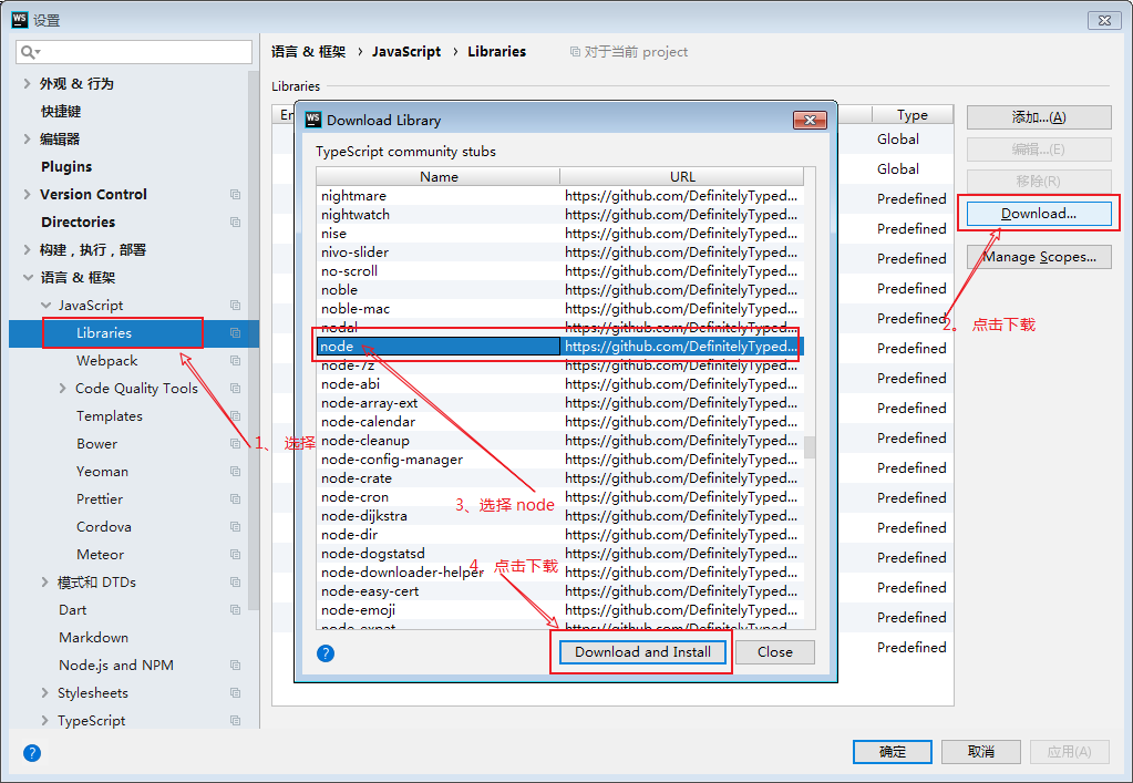 默认情况下,应该是打钩之后就会自动下载库的,没有下载的话,检查一下网络和npm,如果以上都不能解决,还有一个办法,就是手动添加Node的库了。