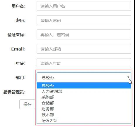 通过上图,可以清晰的看到,我们已经将完整的数据提交到后台 后台获取到这些数据之后,就能够将其保存到数据库中 那么,我们的保存功能就算完成了 更新功能: 更新和保存只有一个地方不同,就是需要数据回显 而数据回显中,我们只对部门(下拉框)和超级管理员(复选框)做一个说明,其他的因为都是普通的input元素,使用value属性显示数据即可 而下拉框和复选框需要单独进行处理,如下: <c:forEach var="d" items="{d.id}" {d.name} </c:forEach>
