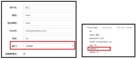 为员工设置所在的部门,用户只需要进行选择即可,然后将选中部门的id传递到服务端 那么问题来了,如何将部门id通过下拉框传递到服务端呢?请看下面的分析 protected void input(HttpServletRequest req, HttpServletResponse resp) throws ServletException, IOException { List departments = departmentService.list(); req.setAttribute("departments", departments); String id = req.getParameter("id"); if (!StringUtils.isNullOrEmpty(id)) { Employee employee = service.get(Long.valueOf(id)); req.setAttribute("employee", employee); } req.getRequestDispatcher("/WEB-INF/views/employee/input.jsp").forward(req, resp); } <c:forEach var="d" items="{d.id}" >${d.name} </c:forEach> 首先,在跳转到该页面之间,我们先将所有的部门信息查询到 然后在页面上循环遍历,生成对应的option元素,将部门的id作为option的value(提交的数据),将部门的name作为option的文本内容(显示的数据) 最后,在用户选择对应选项后,提交表单,会将对应option元素的value提交到后台,完整数据如下: