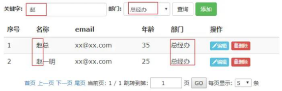 <input type="checkbox" id="admin" name="admin" ${employee.admin?'checked':''}> 这里,我们选择使用EL表达式的三元运算符进行判断,为下拉框添加selected属性,为复选框添加checked属性 编辑的时候,数据能回显,接下来的操作和新增一致 删除功能 和部门的删除一致,这里就不再赘述 到此,员工的CRUD结束 高级查询 功能需求: 输入关键字和部门信息进去过滤查询,关键字是根据姓名和邮箱两个字段查询 页面设计