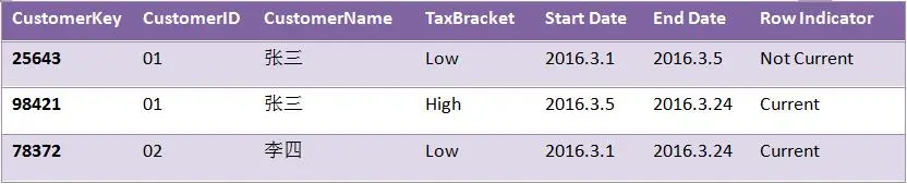 可以看到用户张三对应新维度的TaxBracket状态由Low变成了High。如果需要统计张三的相关行为,那么可以让所有记录用CustomerID字段Join事实表;如果要统计当前TaxBracket为Low的用户状态,则可将Row Indicator字段为Current的记录用CustomerKey字段Join事实表;如果要统计历史TaxBracket状态为Low的用户情况,则只需要将TaxBracket属性为Low的用户记录的CustomerKey属性与事实表关联。