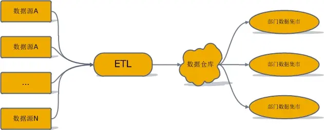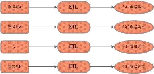 从技术上来讲这是一种很不值得推崇的方式,因为将使信息分散,影响了企业全局范围内数据分析的效率。此外,各组织之间的ETL架构相互独立无法复用,也浪费了企业的开发资源。然而出于某些公司制度及预算方面的考虑,有时也会使用到这种建模体系。