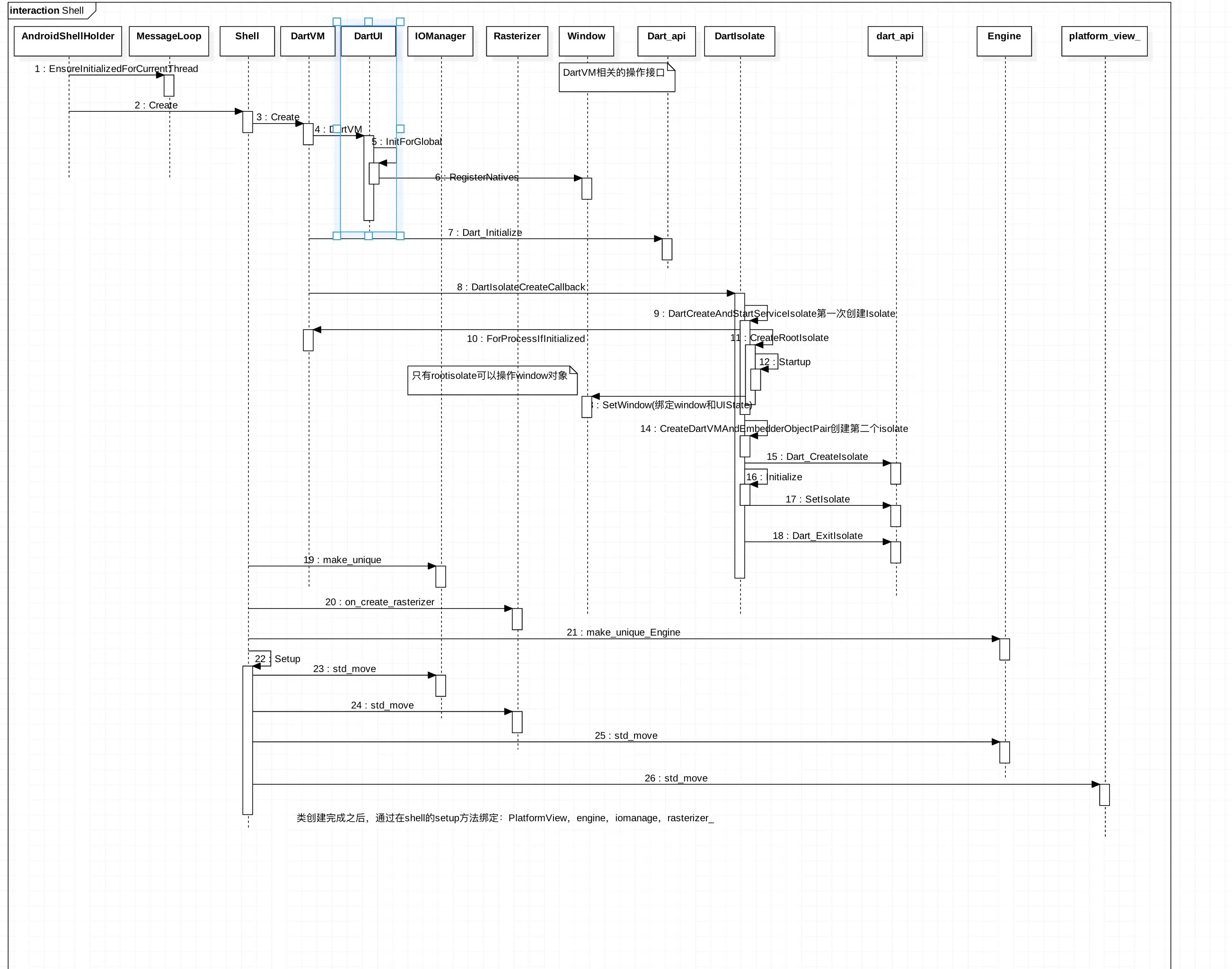 `engine/src/flutter/shell/common/shell.cc`作为一个中枢控制作用,使用弱引用来保存PlatformView,Android,ios保存使用shell中Platform下的Platefrom实现来处理平台相关的View,Shell的初始化是在`engine/src/flutter/shell/platform/android/android_shell_holder.cc`,`FlutterMain::Get().GetSettings()`编译时的配置文件`engine/src/flutter/common/settings.cc`,`flutterJNI`是android层的代码,`is_background_view`是在java层FlutterNativeView,这是Java和JNI的通信,数据传输逻辑处理,FlutterNativeView的构造方法中调用JNI代码,初始化`android_shell_holder`使用这个类来全部`Shell`这个类