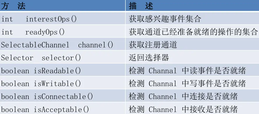而关于这个selectionKey,它表示着SelectableChannel和Selectr之间的注册关系。它也有一系列对应的方法