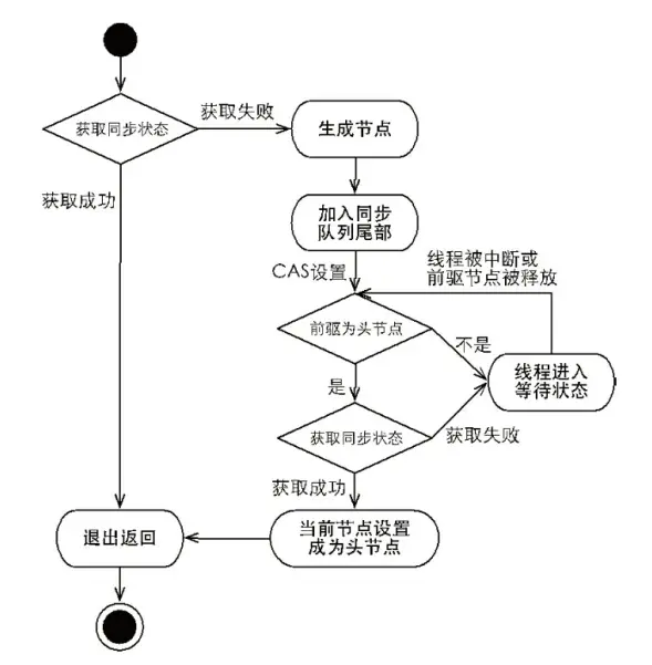 获取失败的线程,加入到同步队列的队尾;加入到队列中后,如果当前节点的前驱节点为头节点再次尝试获取同步状态(下文代码:p == head && tryAcquire(arg))。
