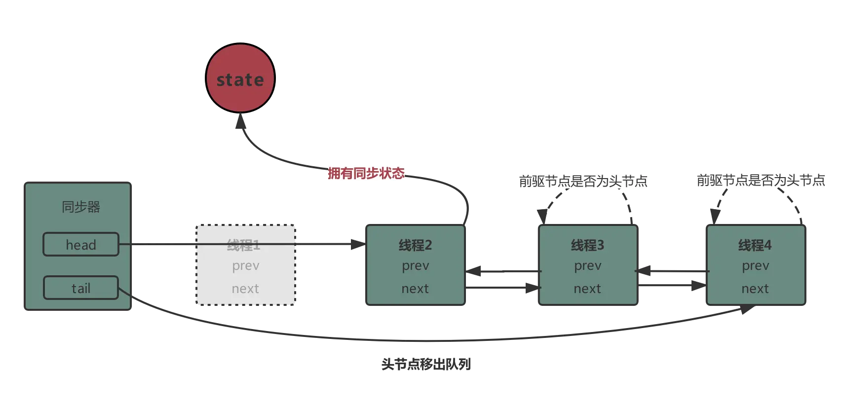 后继节点获取同步状态成功,头节点出队。需要注意的事,出队操作是间接的,有节点获取到同步状态时,会将当前节点设置为head,而原本的head设置为null。
