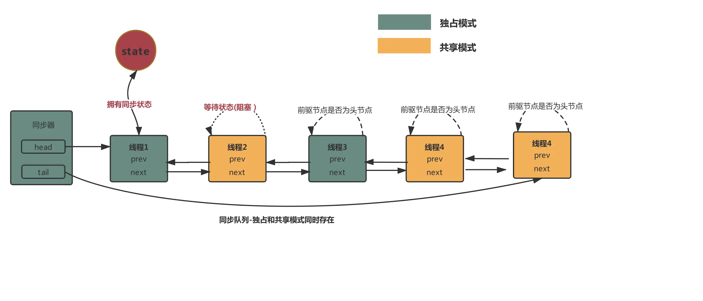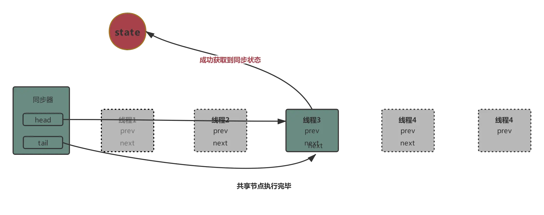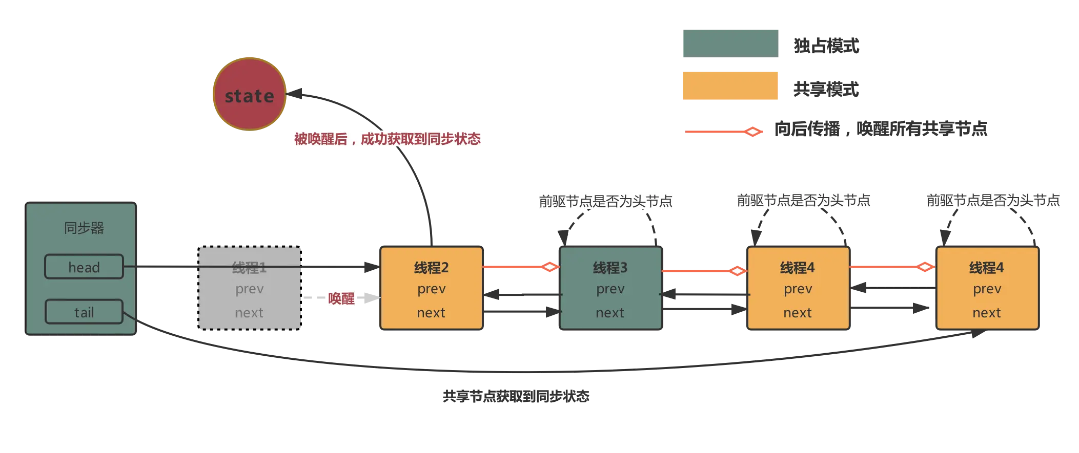 - 共享模式下的节点获取到同步状态或者释放同步状态时,不仅会唤醒后继节点,还会向后传播,唤醒所有同步节点