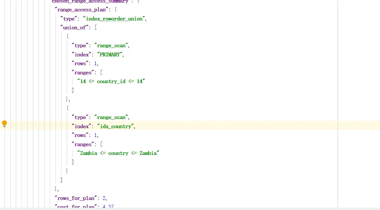 | 1 | SIMPLE | country | NULL | index_merge | PRIMARY,idx_country | PRIMARY,idx_country | 2,152 | NULL | 2 | 100.00 | Using union(PRIMARY,idx_country); Using where |