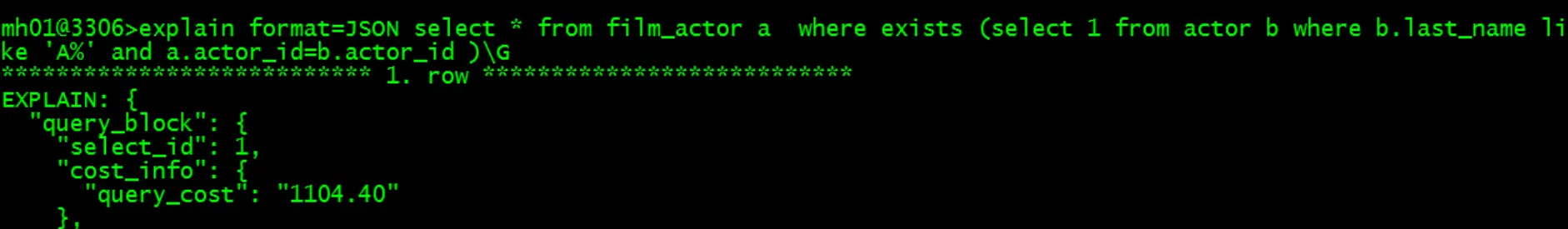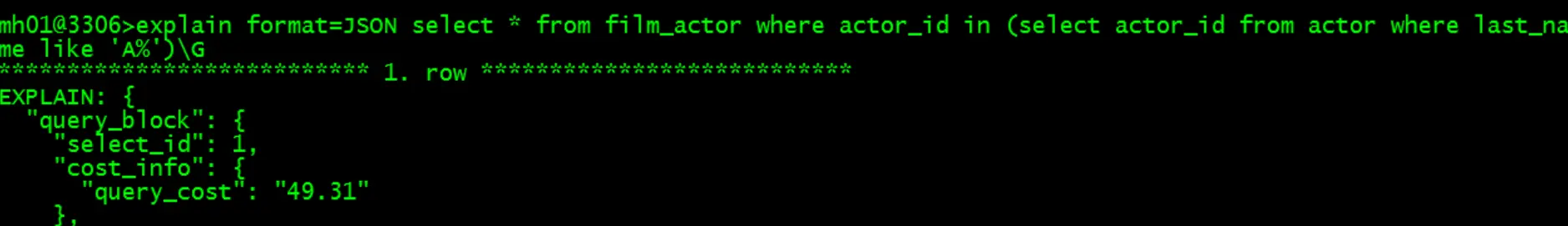 在这种情况下如果想要获取last_name为A开头的人对应的film信息,就有两种方式,也就是用in或者是exists的方式。区别就是驱动表不同。现在测试一下两种方式的开销