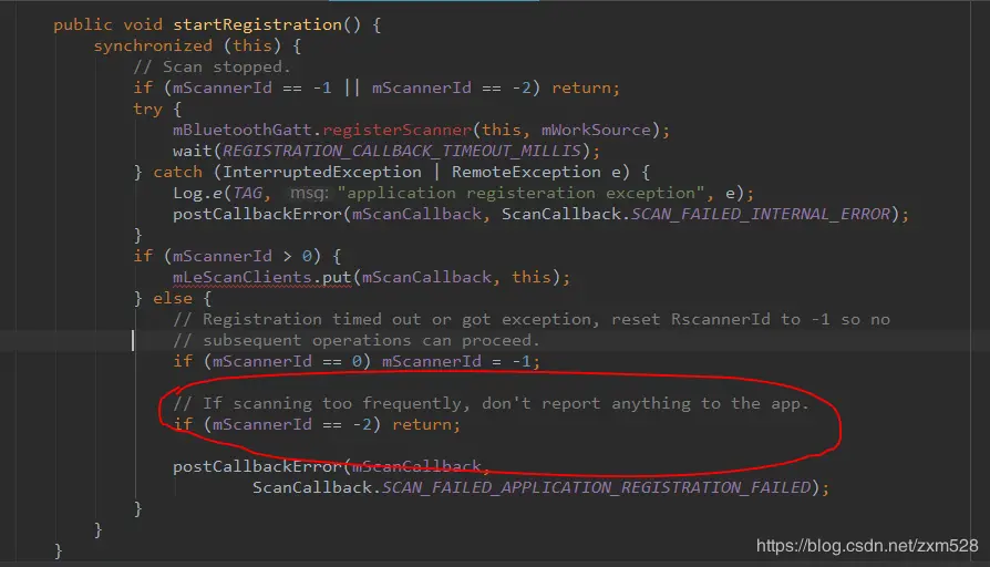 我们在开发低功耗蓝牙的过程中,往往会遇到连续使用低功耗蓝牙的扫描(bluetoothLeScanner.startScan())几次后就会出现,扫描不到任何设备的情况。我们查看日志发现:当出现这种问题时,一般日志会出现2019-11-22 15:58:00.281 2216-3350/? E/BtGatt.GattService: App '***' is scanning too frequently这样的信息。估计好多人也像我一样扫描太频繁了??还有这操作,天哪这怎么整?如果小伙伴看了我上一篇文章了,就会发现在BluetoothLeScanner中的BleScanCallbackWrapper有一个startRegistration()的方法,如下图:
