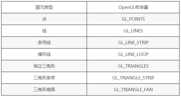 OpenGL可以支持很多不同的图元类型,最基础的为点,线,或三角形。线和三角形可以组合成条带,循环体或者扇面三角形。点,线,或三角形也是大部分图象硬件设备支持的基础图元类型。