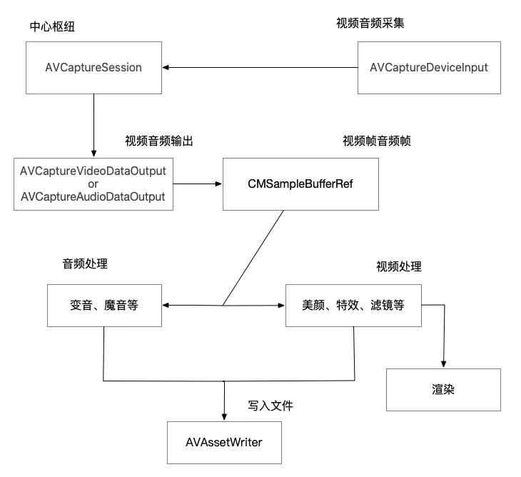 AVCaptureSession-- 是AVFoundation捕捉视频类的中心枢纽AVCaptureVideoPreviewLayer-- 是CoreAnimation里面layer的一个子类,用来做为AVCaptureSession预览视频输出AVCaptureDevice-- 每个实例对应一个设备,如摄像头或麦克风。AVCaptureDeviceInput-- 是AVCaptureSession输入源,提供媒体数据从设备连接到系统AVCaptureConnection-- 代表AVCaptureInputPort或端口之间的连接,和一个AVCaptureOutput或AVCaptureVideoPreviewLayer在AVCaptureSession中的呈现AVCaptureMovieFileOutput-- AVCaptureMovieFileOutput是AVCaptureFileOutput的子类,用来写入QuickTime视频类型的媒体文件AVCaptureVideoDataOutput-- 是AVCaptureOutput一个子类,可以用于用来输出未压缩或压缩的视频捕获的帧AVCaptureAudioDataOutput-- 是AVCaptureOutput的子类,可用于用来输出捕获来的非压缩或压缩的音频样本AVAssetWriter-- 为写入媒体数据到一个新的文件提供服务,AVAssetWriter的实例可以规定写入媒体文件的格式,如QuickTime电影文件格式或MPEG-4文件格式等等AVAssetWriterInput去拼接一个多媒体样本类型为CMSampleBuffer的实例到AVAssetWriter对象的输出文件的一个轨道