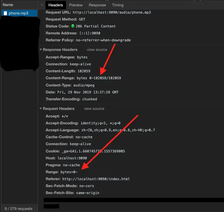 Request Headers中有个Range: bytes=0-,Range代表指示服务器应该返回文件的哪一或哪几部分。end是一个整数(如:Range: bytes=0-136868),表示在特定单位下,范围的结束值。这个值是可选的,如果不存在,表示此范围一直延伸到文档结束。 - 假如在响应中存在