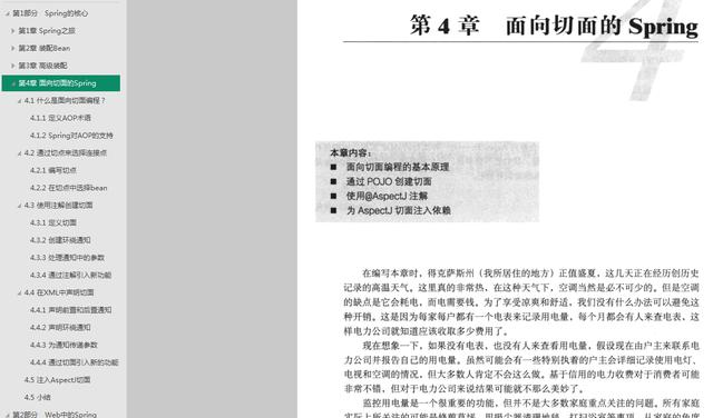第4章介绍如何使用Spring的AOP来为对象解耦那些对其提供服务的横切性关注点。这一章也为后面各章提供基础,在后面读者将会使用AOP来提供声明式服务,如事务、安全和缓存。