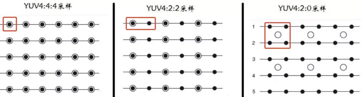 注:黑点表示采样该像素点的Y分量,空心圆圈表示采用该像素点的UV分量。