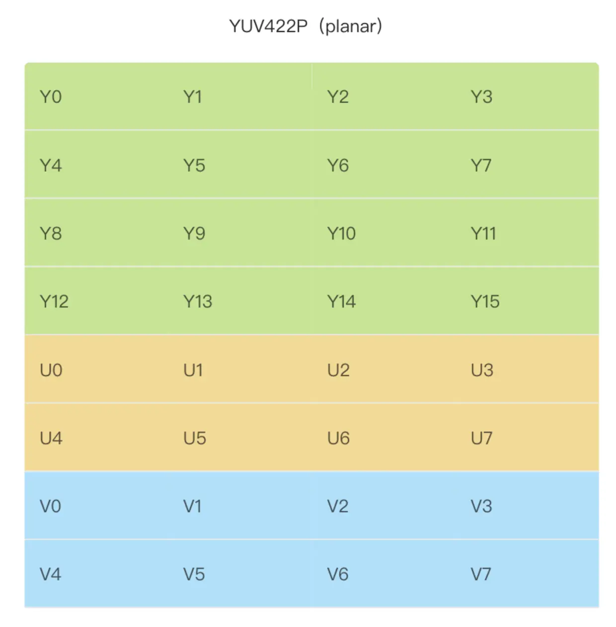 YUV422P(planar,每两个 Y 共用一组 UV 分量,所以 U和 V 会比 YUV420P U 和 V 各多加一行):