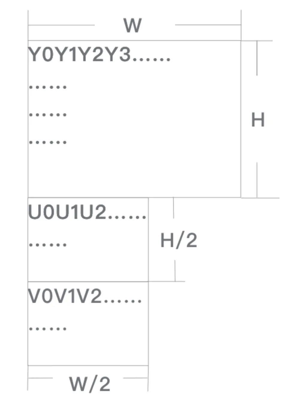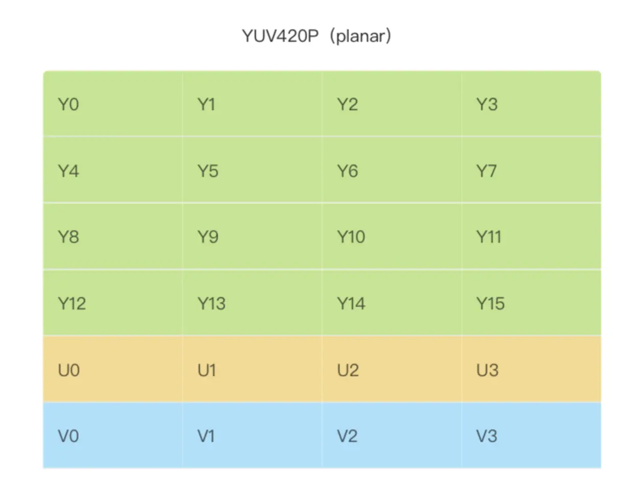 - planar 的YUV格式,先连续存储所有像素点的Y,紧接着存储所有像素点的U,随后是所有像素点的V。