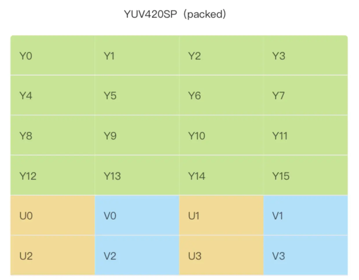 YUV420SP(packed,每四个 Y 会共用一组 UV 分量,和YUV420P不同的是,YUV420SP存储的时候 U,V 是交错存储):