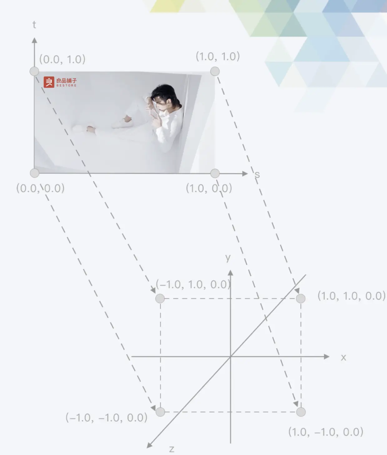 由于每个视频帧的图像都不太一样,我们肯定不可能知道那么多顶点,那么我们怎么将视频帧的图像用 webgl 画出来呢?这里使用了一个技巧—纹理映射。简单来说就是将一张图像贴在一个几何图形表面,使几何图形看起来像是有图像的几何图形,也就是将纹理坐标和 webgl 系统坐标进行一一对应: