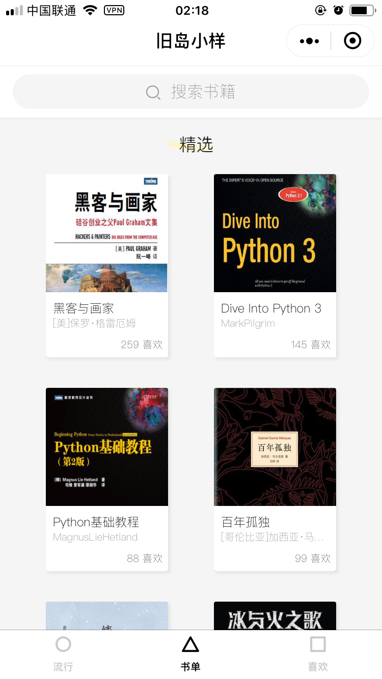 参数字段 含义 author 作者 fav_nums 点赞数 id 书籍ID image 书籍图片 like_status 是否点赞 title 书籍题目 未完待续。。。