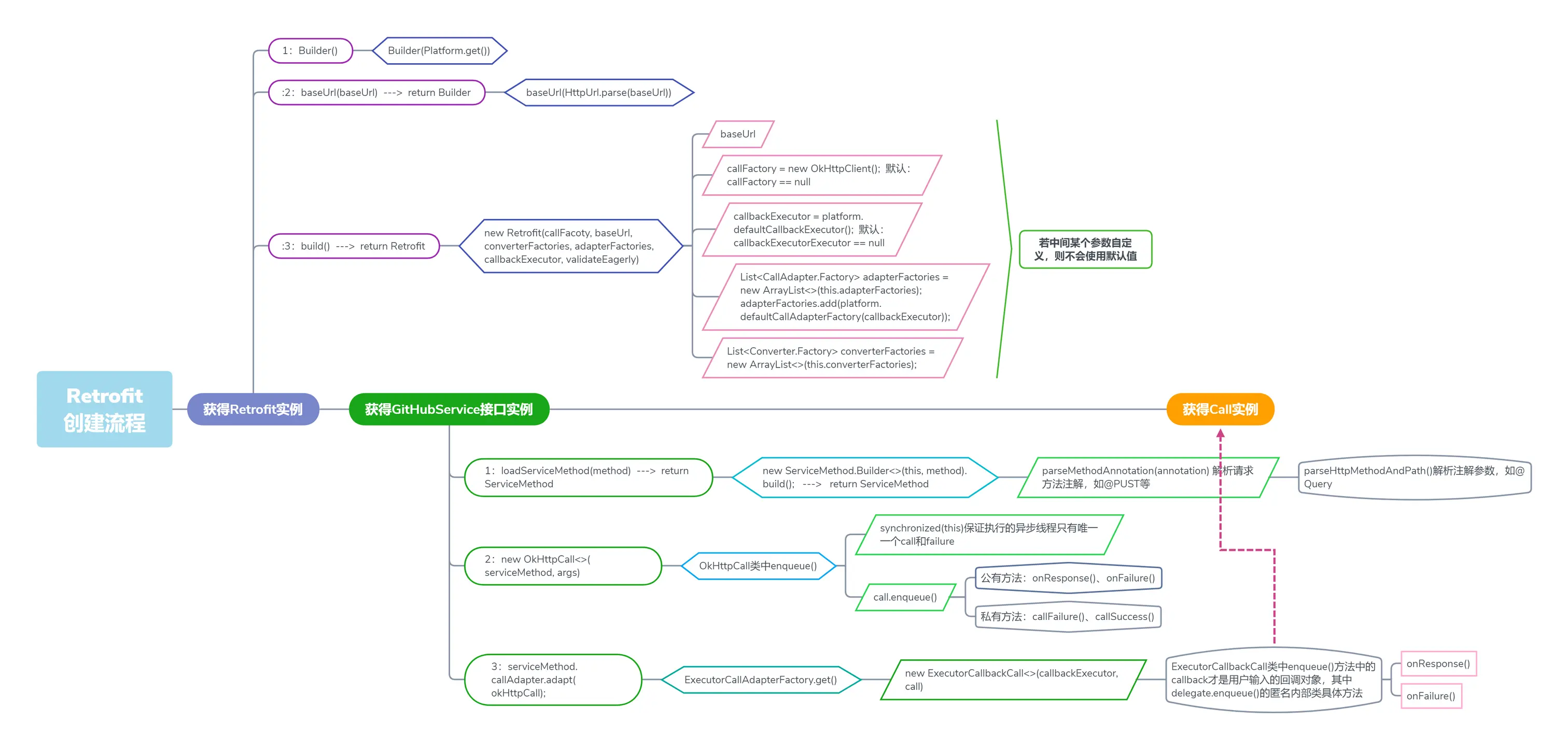 okHttp3.Call.Factory callFactory,默认是new OkHttpClient();须判断是否为null,为空则使用默认Executor callbackExecutor,默认是platform.defaultCallbackExecutor();须判断是否为null,为空则使用默认List<CallAdapter.Factory> adapterFactories,通过add(platform.defaultCallAdapterFactory(callbackExecutor);该方法无需判断是否为nullList<Converter.Factory> converterFactories,通过new ArrayList<>(this.converterFactories);该方法无须判断为null,但会通过成员变量来初始化该变量。