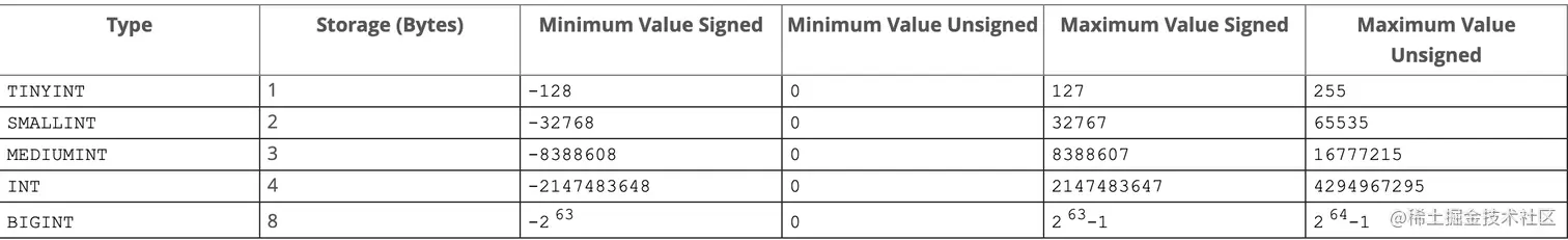 存储的值为整数,包含五个子类:TINYINT / SMALLINT / INT / MEDIUMINT / BIGINT, 存储的范围见下图: