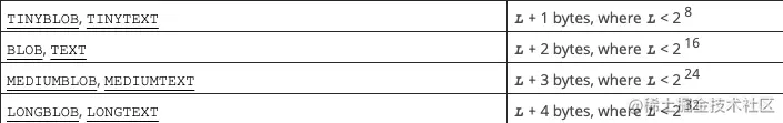 BLOB和TEXT存储占用的字节(L表示可存储的字节,实际占用的字节比L大,因为额外的字节被用于表示长度)