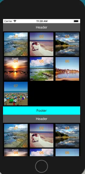 分为上下两组,在程序中定义的Section 在每一组Section中,有上面的UILabel Header和下面的UI Label Footer。在每个Section中,定义每个存储图片的单元格为一个cell。