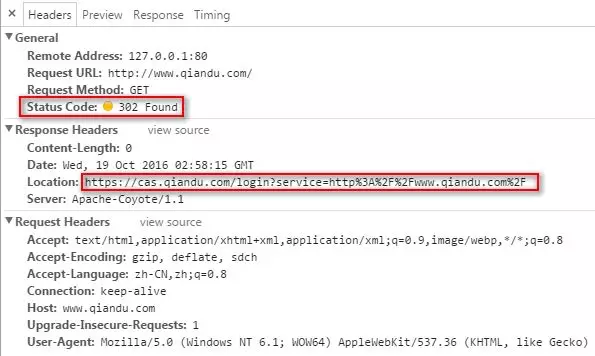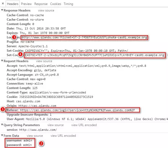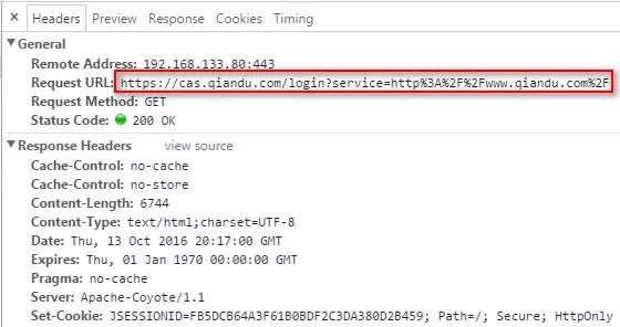 首先可以看到我们请求www.qiandu.com,之后浏览器返回状态码302,然后让浏览器重定向到cas.qiandu.com并且通过get的方式添加参数service,该参数目的是登录成功之后会要重定向回来,因此需要该参数。并且你会发现,其实server的值就是编码之后的我们请求www.qiandu.com的地址。