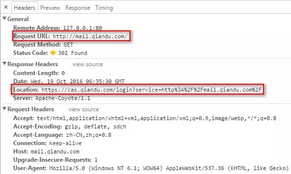 上图可以看到,用户请求mail.qiandu.com,然后返回给他一个网址,状态302重定向,service参数就是回来的地址。