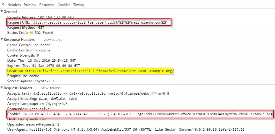 上图就是标号5的请求,以及标号6的响应了。当cas.qiandu.com即csa-server认证通过之后,会返回给浏览器302,重定向的地址就是Referer中的service参数对应的值。后边并通过get的方式挟带了一个ticket令牌,这个ticket就是ST(数字3处)。同时会在Cookie中设置一个CASTGC,该cookie是网站cas.qiandu.com的cookie,只有访问这个网站才会携带这个cookie过去。