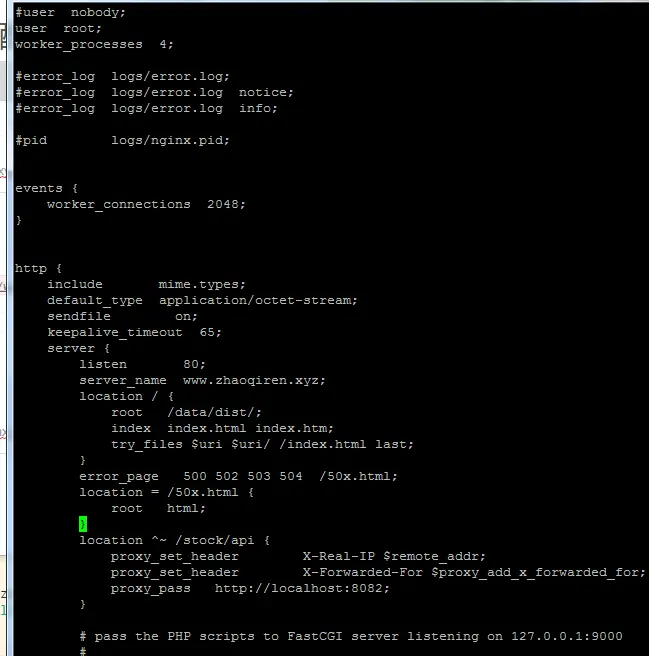 vue打包后放到与后端node同一个服务器上,使用相同域名,vue项目端口为80,node项目端口为8082,在网页中访问www.zhaoqiren.xyz能够访问到vue项目,但是此时项目缺无法从后台接口接收数据了,一直显示 500错误.现将部分配置截图如下: