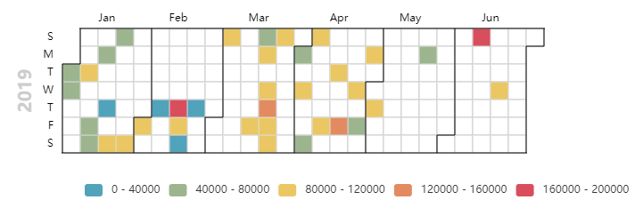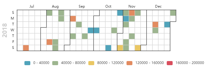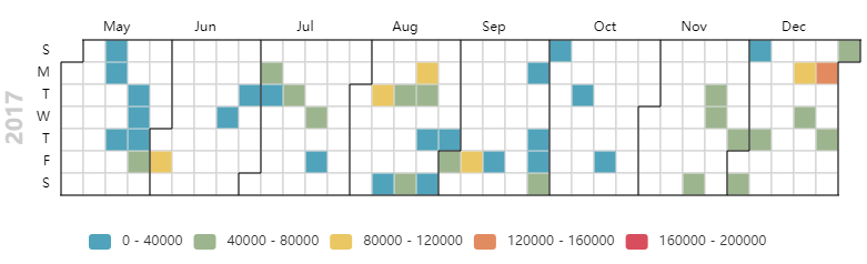 calendar = ( Calendar(init_opts=opts.InitOpts(width='1800px',height='1500px')) .add("", data,calendar_opts=opts.CalendarOpts(range_=['2017-05-01', '2017-12-31'])) .set_global_opts( title_opts=opts.TitleOpts(title="思聪2017年热搜",pos_left='15%'), visualmap_opts=opts.VisualMapOpts( max_=200000,min_=0,orient="horizontal",is_piecewise=True,pos_top="230px",pos_left="100px",pos_right="10px")) .render('2017日期热力图.html'))