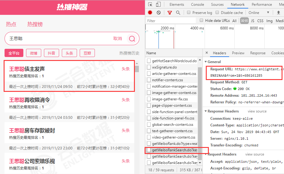 resou = pd.DataFrame(columns=['datetime','title','searchCount'])for i in range(1,20): url= 'https://www.enlightent.cn/research/top/getWeiboRankSearch.do?keyword=王思聪&from='+ str(i) +'&t=395201742&type=realTimeHotSearchList' html = requests.get(url=url, cookies=cookie, headers=header).content data = json.loads(html.decode('utf-8')) for j in range(20): #一页20个 resou = resou.append({'datetime':stampToTime(data['rows'][j]['updateTime']), 'title':data['rows'][j]['keywords'],'searchCount':data['rows'][j]['searchNums'], },ignore_index=True)resou.to_csv("resou.csv", index_label="index_label",encoding='utf-8-sig')