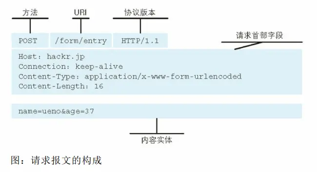 - 报文首部:请求方法、请求 URI、协议版本、可选的请求首部字段等