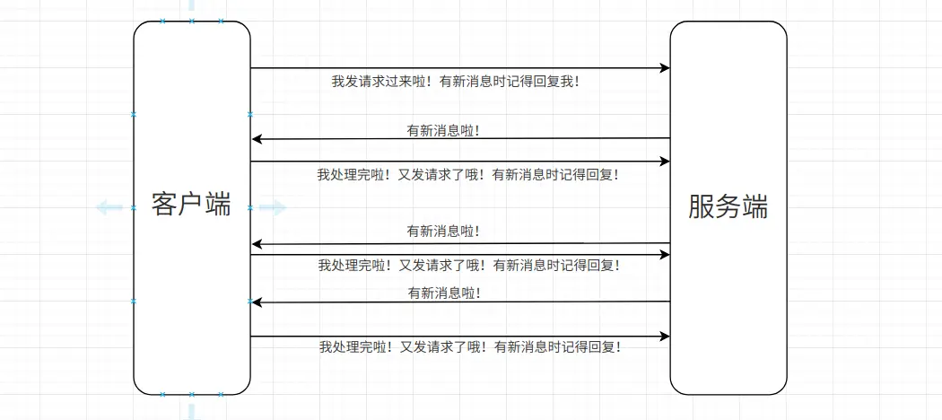 客户端向服务器发送请求,服务器收到请求后先按住不回复,直到有新消息时再返回响应并关闭连接;客户端处理完响应信息后再像服务器发送新的请求。