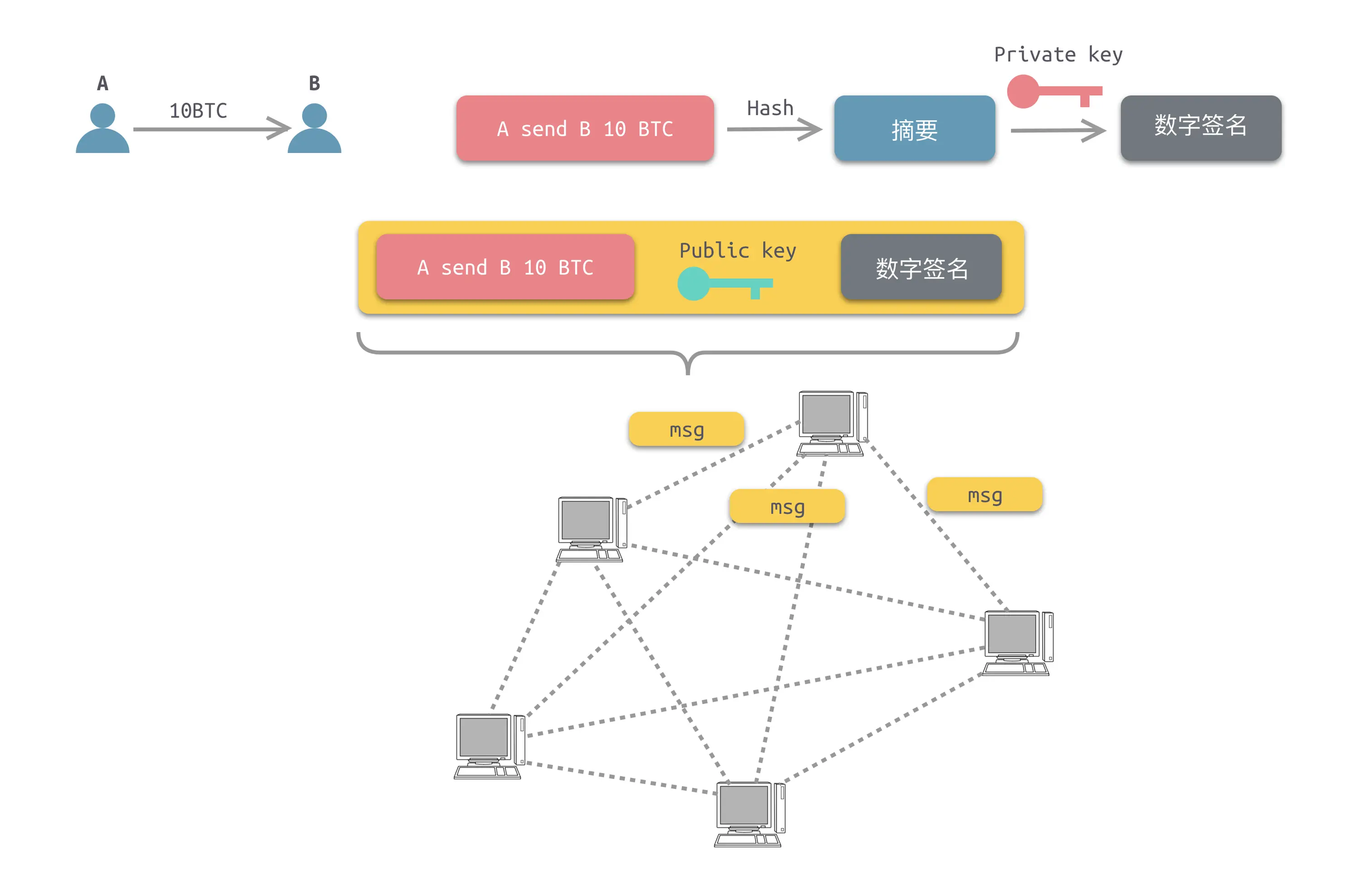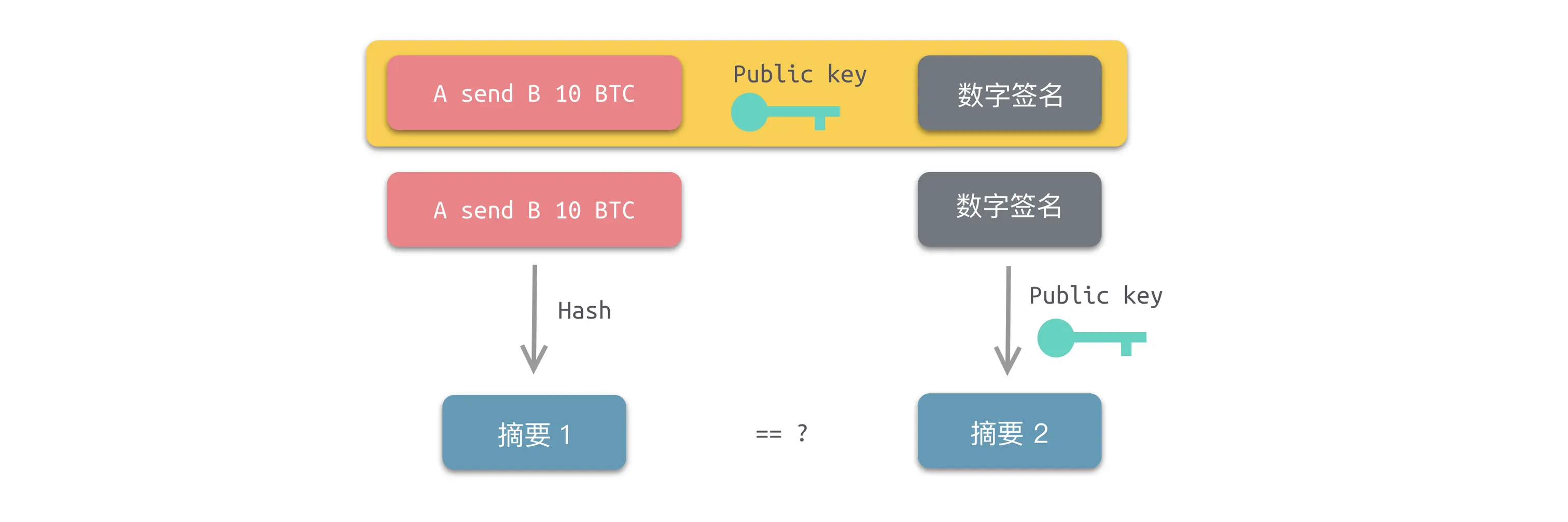 如果摘要 1 和摘要 2 一致,则证明交易内容是真实的,在广播过程中并未被篡改。那么如何证明消息的发起者也是 A 呢?毕竟,我们不能认可 B 发消息说 C 向 B 付款 10 BTC 这种内容。消息发起者必须是付款方。