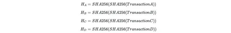 首先,对每个交易进行加密哈希运算(Double-SHA256)得到叶子节点。
