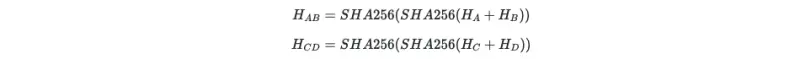 下图所示,为我们对 A、B、C、D 4 个交易构建默克尔树的示例。
